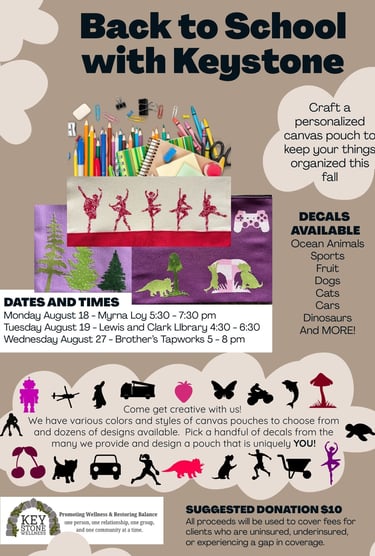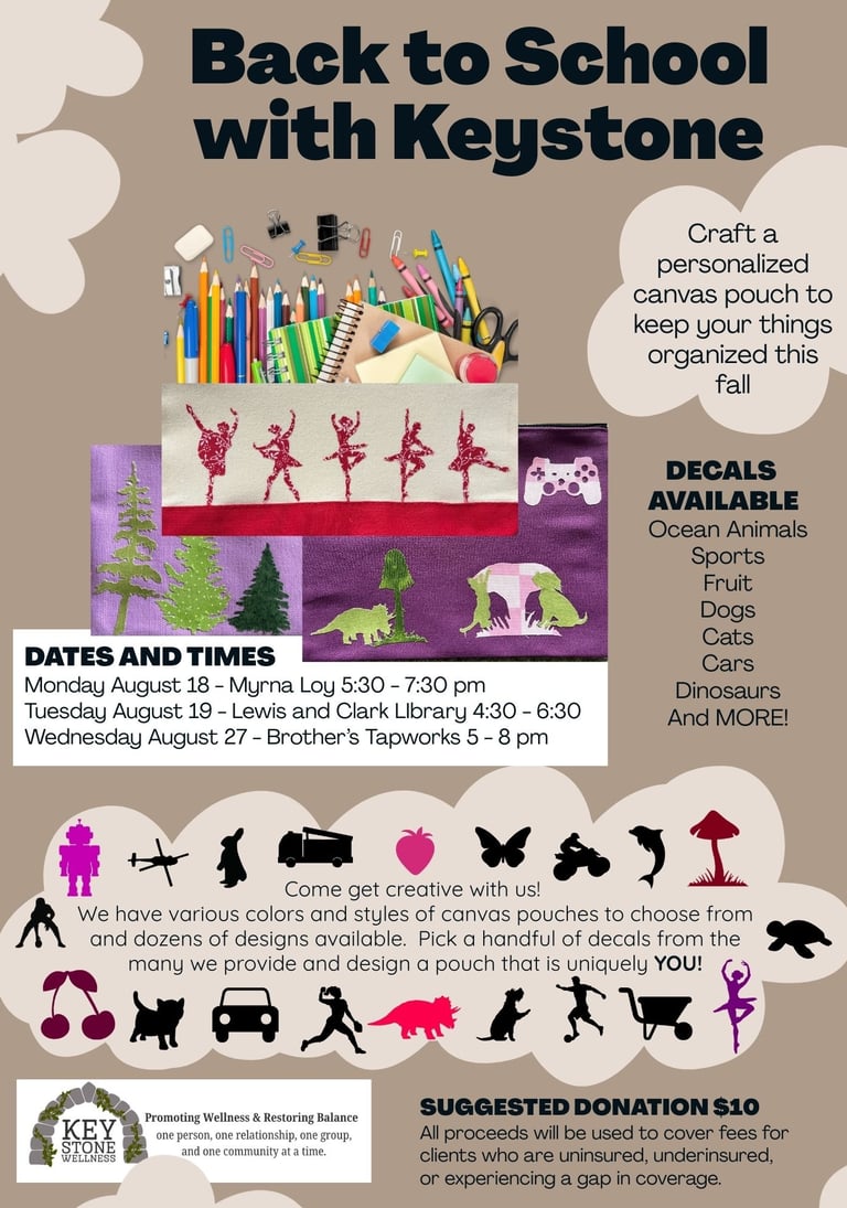Join us to make a personalized pouch to store pen, pencils, and markers and help members of our community to access mental health services at this series of community events.